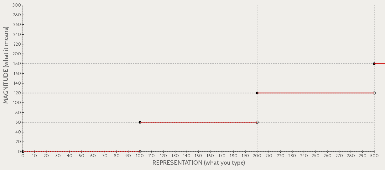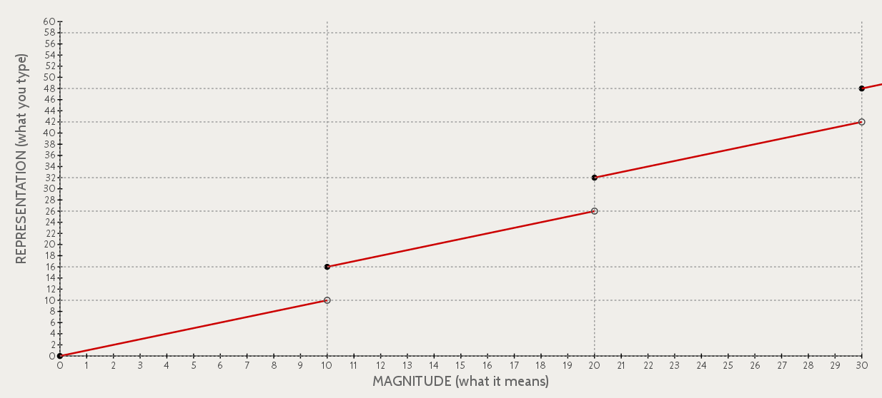 Here is a graph showing how the number you type (REPRESENTATION) in relates to the amount of time the microwave will run (MAGNITUDE). (For simplicity, the graph is drawn as a sequence of continuous lines, even though the function is only defined for integer values.)